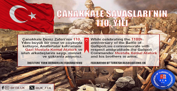 İngiltere Türk Dernekleri Federasyonu : “Bugün, Türk milletinin bağımsızlık mücadelesinin ve vatan sevgisinin en büyük destanlarından biri olan Çanakkale Zaferi’nin 110. yıl dönümünü anmanın gururunu yaşıyoruz. Çanakkale, yalnızca bir savaş değil, azmin, inancın ve fedakarlığın sembolüdür. “Çanakkale Geçilmez” sözü, milletimizin bağımsızlığa olan sarsılmaz bağlılığının en güçlü ifadesidir.Bu büyük zaferin mimarı, Gazi Mustafa Kemal Atatürk ve silah arkadaşları, imkansızlıklar içinde gösterdikleri üstün liderlik ve cesaretle tarihin akışını değiştirmiştir. Atatürk'ün “Ben size taarruzu değil, ölmeyi emrediyorum” sözleri, Türk askerinin vatan sevgisini ve mücadele ruhunu en güçlü şekilde ortaya koymuştur.Son zamanlarda Çanakkale Savaşları’nı Mustafa Kemal’siz anma girişimlerine karşı, Winston Churchill’in şu sözlerini hatırlatmak yerinde olacaktır: “Mustafa Kemal, Çanakkale’de karşımıza çıkmasaydı, muhtemelen İstanbul’u ele geçirirdik.” Bu sözler, Atatürk’ün savaşın seyrini değiştiren rolünü açıkça ortaya koymaktadır.”