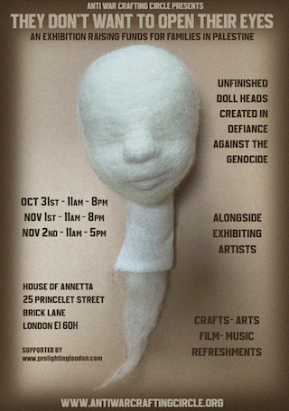 Gözlerini Açmak İstemiyorlar” başlıklı sergiye, 31 Ekim, 1 ve 2 Kasım günlerinde London E1 6QH adresindeki House of Annette galerisi ev sahipliği yapıyor. Farklı geçmişlerden sanatçıların, zanaatkarların ve sanat terapistlerinin çalışmalarının sunulacağı sergide Abdal Boksh, Alberto Casas, Ann Healey, Asta Binkauskaite, Bettina Schroeder, Clare Payne, Corrina Eastwood, Elm Grace, Iara Lee, Jean-Jacques Bonneau, Jennie Temple, Jude Montague, Lex Franchi, Lieta Marziali, Olivia Monthan, Rachel Pearce, Raine Kenny, Sanjay Dasani, Simon Noyes, Suzanna Treumann Stacey Kiely’nin, bağışladıkları eserler de yer alacak. Barış ve direnişi önceleyen bu ortak çalışmadan elde edilen gelir, Birleşmiş Milletler Filistin Yardım Kuruluşu’na (UNRWA) bağışlanacak.