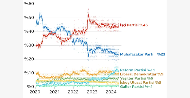 Son kamuoyu yoklamaları, Muhafazakar Parti'nin seçim yarışına İşçi Partisi'nin çok gerisinde başladığını gösteriyor.Aslında son 12 aydır tablo hemen hemen bu şekilde. Anketlerdeİşçi Partisi sürekli olarak %40'ın üzerinde görünüyor.Kamuoyu yoklamalarıElbette anketler her zaman doğru çıkmayabilir ve Sunak kampanyasında ilerledikçe enflasyondaki yavaşlama ile partisinin odaklanacağı politikaların bu durumu tersine çevirmesine yardımcı olacağını umuyor.Ancak şu anki duruma bakıldığında İşçi Partisi'nin yarışa açık ara önde başladığı görülüyor.Göçmen karşıtı olarak tanımlanabilecek Reform Partisi üçüncü sırada yer alsa da sağ eğilimli partiye destek ülke geneline eşit şekilde yayıldığı için bunun parlamentoda sandalye sayısına nasıl yansıyacağını kestirmek biraz zor.Geçtiğimiz yıllarda ülkenin en büyük üçüncü partisi olan Liberal Demokratlara destek ise yüzde 10 civarında. Partinin almak istediği sandalyelere odaklanarak seçimde kazanımlar elde etmeye çalışacağı düşünülüyor.Liberal Demokratlar 2010-2015 arası Muhafazakar Parti ile koalisyon hükümeti olarak iktidardaydı.Hükümetin sığınmacıları Ruanda'ya gönderme planı ne olacak?
