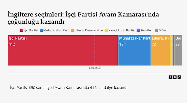BBC Türkçe'nin habeeri şöyle: İşçi Partisi'nin Avam Kamarası'nda çoğunluğu elde etmesiyle İngiltere'de 14 yıllık Muhafazakar Parti yönetimi sona erdi.Starmer'ın açıkladığı kabinede Angela Rayner Başbakan Yardımcısı, Rachel Reeves ise İngiltere'nin ilk kadın maliye bakanı oldu.Yeni İçişleri Bakanı Yvette Cooper, Dışişleri Bakanı David Lammy ve Savunma Bakanı John Healey oldu.