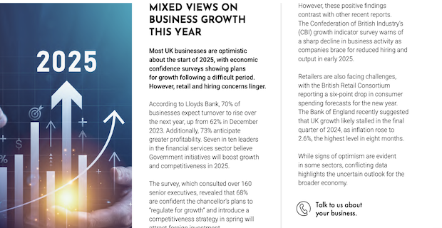Lloyds Bank'a göre işletmelerin %70'i cirolarının önümüzdeki yıl artacağını öngörüyor, bu oran Aralık 2023'te %62 idi. Ayrıca, %73'ü daha yüksek karlılık bekliyor. Finansal hizmetler sektöründeki on liderden yedisi, Hükümet girişimlerinin 2025'te büyümeyi ve rekabeti artıracağına inanıyor. 160'tan fazla üst düzey yöneticiye danışılan anket, %68'inin şansölyenin "büyüme için düzenleme" ve ilkbaharda bir rekabet stratejisi getirme planlarının yabancı yatırımı çekeceğinden emin olduğunu ortaya koydu. Ancak, bu olumlu bulgular diğer son raporlarla çelişiyor.