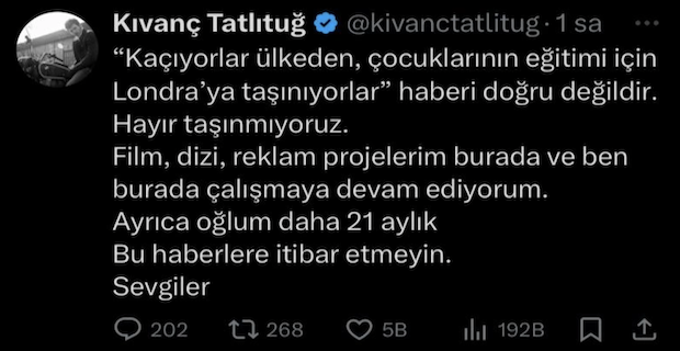 “Kaçıyorlar ülkeden, çocuklarının eğitimi için Londra’ya taşınıyorlar' haberi doğru değildir. Hayır taşınmıyoruz. Film, dizi, reklam projelerim burada ve ben burada çalışmaya devam ediyorum. Ayrıca oğlum daha 21 aylık. Bu haberlere itibar etmeyin. Sevgiler"