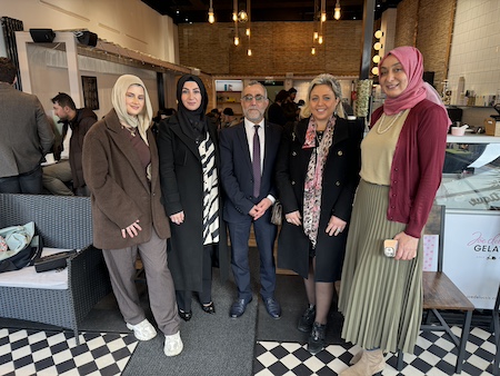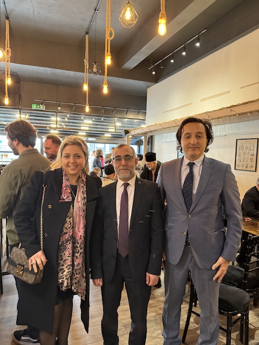Londra Yunus Emre Başkanı Mehmet Karakuş ve Chingford Belediye Meclis üyesi Sazimet Palta-Imre ile gazetemiz editörü Vatan Öz, Stoke Newington’da Eatique açılışında