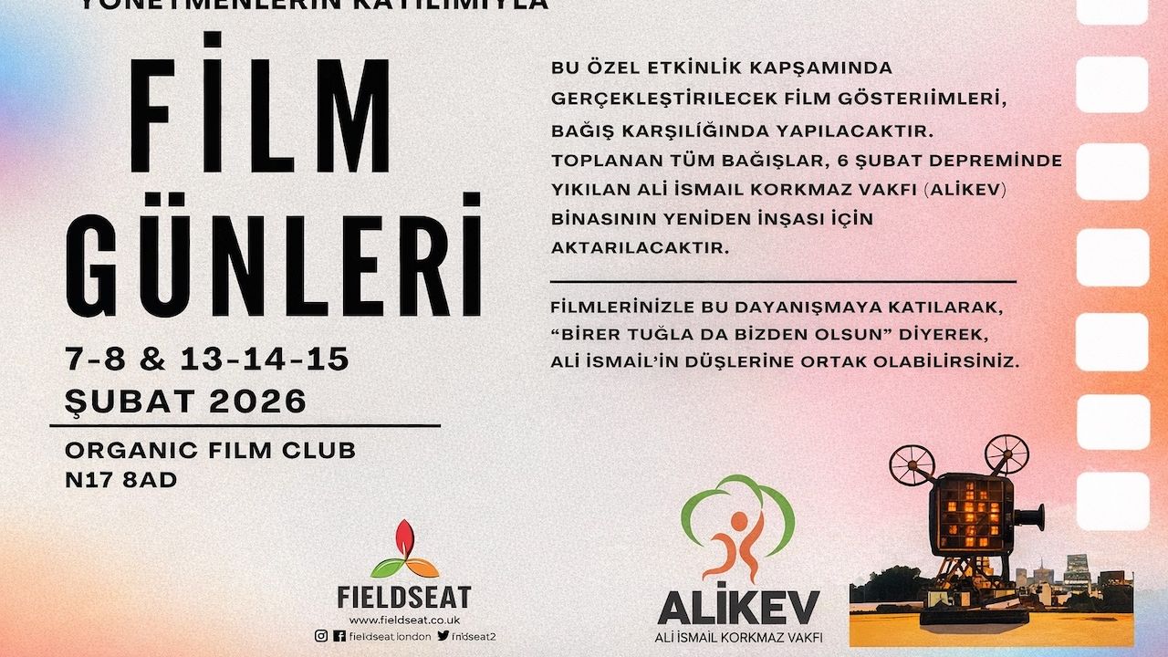 Londra’da sinema ve dayanışma bir araya geliyor. Yönetmenlerin katılımıyla düzenlenecek Film Günleri, 7-8 ve 13-14-15 Şubat 2026 tarihlerinde Organic Film Club’ta (N17 8AD) sinemaseverlerle buluşacak.