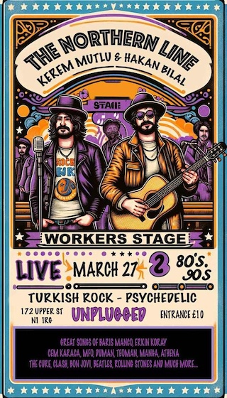 AVRUPA AJANSI (AVA) AVRUPA GAZETESİ-Kuzey Londra Islington'daki Workers Cafe'de Kerem Mutlu ve Hakan Bilal'den oluşan The Northern Line grubu 27 Mart'ta Türkce Akustik Rock konseri veriyor. Rock muziği sevenler için özel hazırlanan konsere tüm Londralılar davet edildi. 80'li ve 90'lı yıllardan TURKISH ROCK - PSYCHEDELIC şarkıların çalınacağı konsere ilgi büyük. BARIS MANCO, ERKIN KORAY CEM KARACA, MFO, PUMAN, TEOMAN, MANGA, ATHENA THE CURE, CLASH, BON JOVI, BEATLES, ROLLING STONES ve daha fazlası konserde