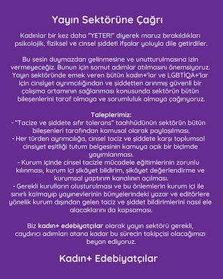 Biz kadın+ edebiyatçılar olarak yayın sektörü gerekli, caydırıcı adımları atana kadar bu sürecin takipçisi olacağımızı beyan ediyoruz.
